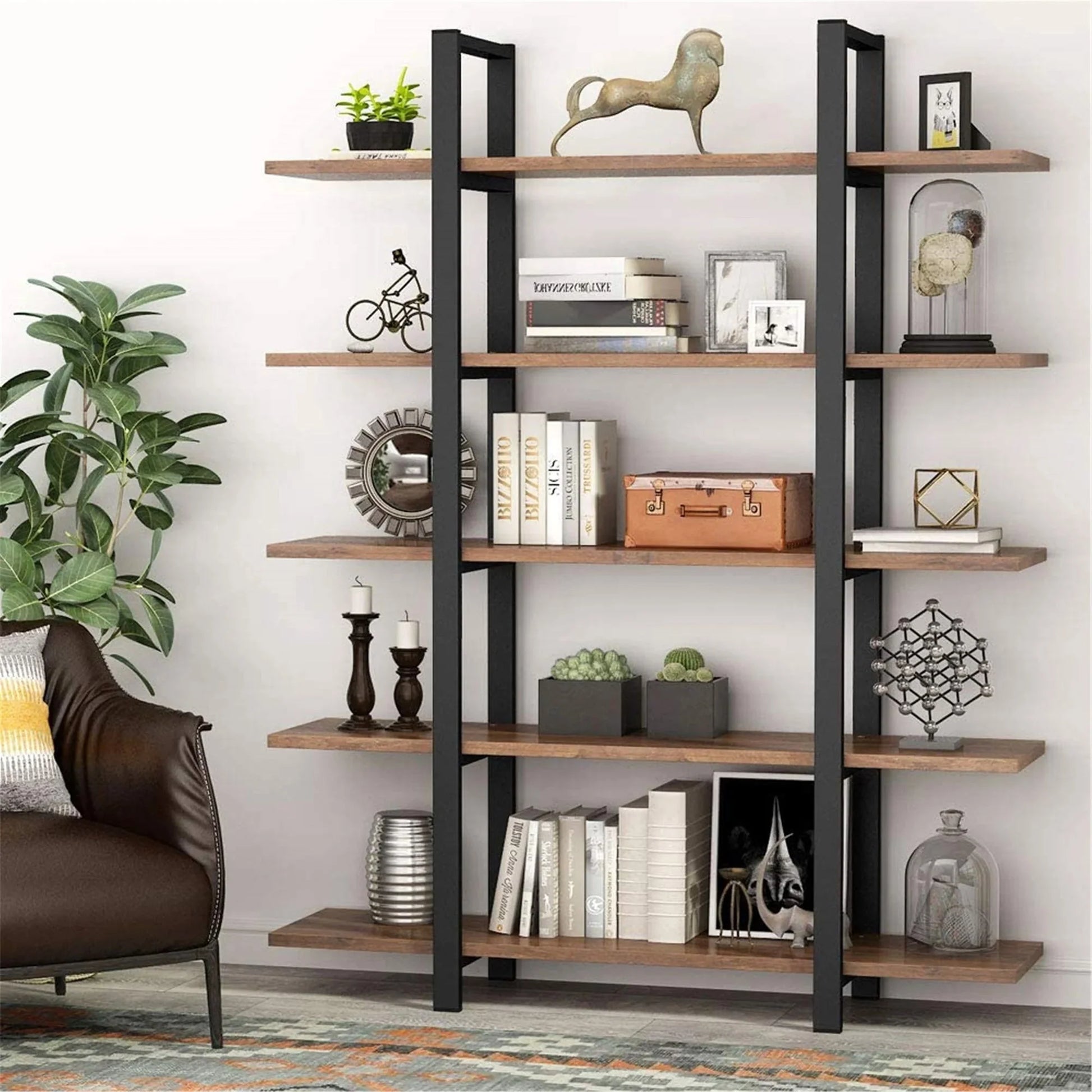 Product Details: This 5-tier bookshelf made of MDF (Medium Density Fiberboard) and metal is a robust and stylish storage solution, perfect for various spaces such as living rooms, offices, or bedrooms. Five spacious shelves provide ample storage space. Ideal for organizing books, decorative items, and other household essentials.