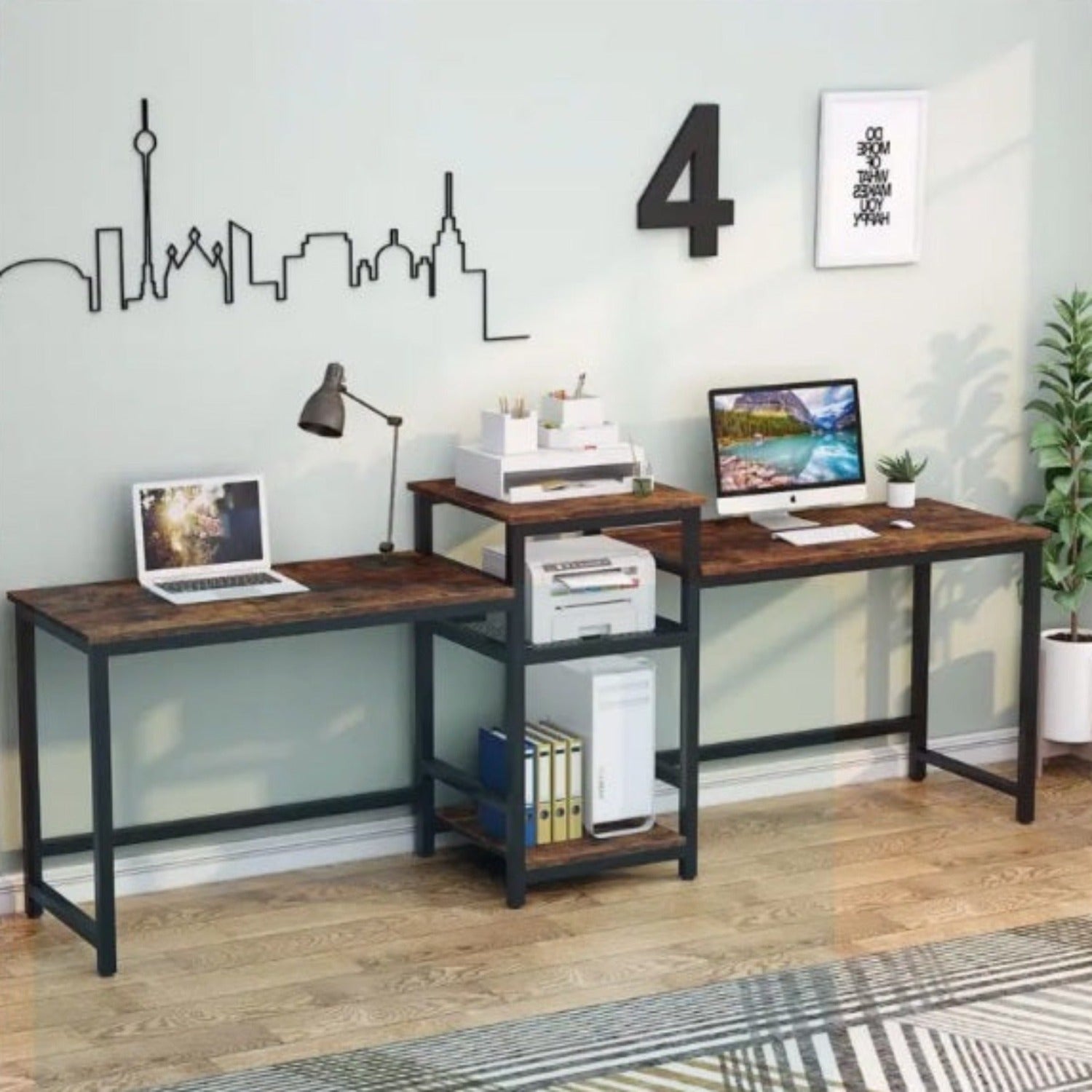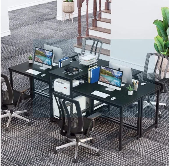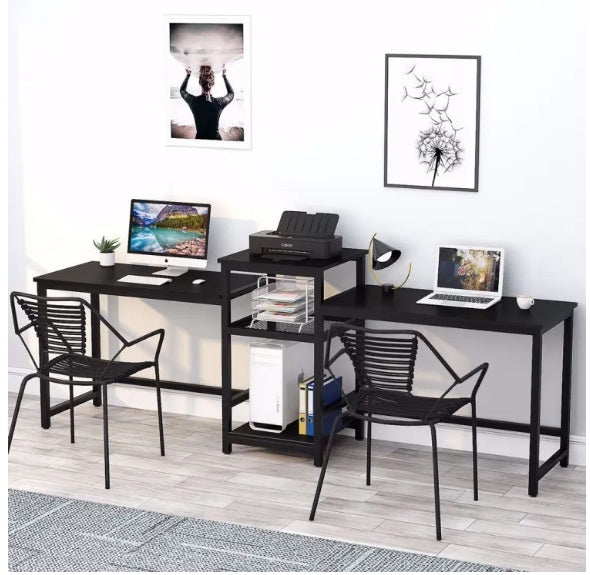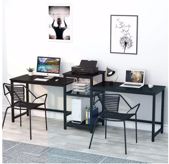 Two Person Desk: It can be used by two persons. An extra shelf for printer and another storage shelf for books and files.